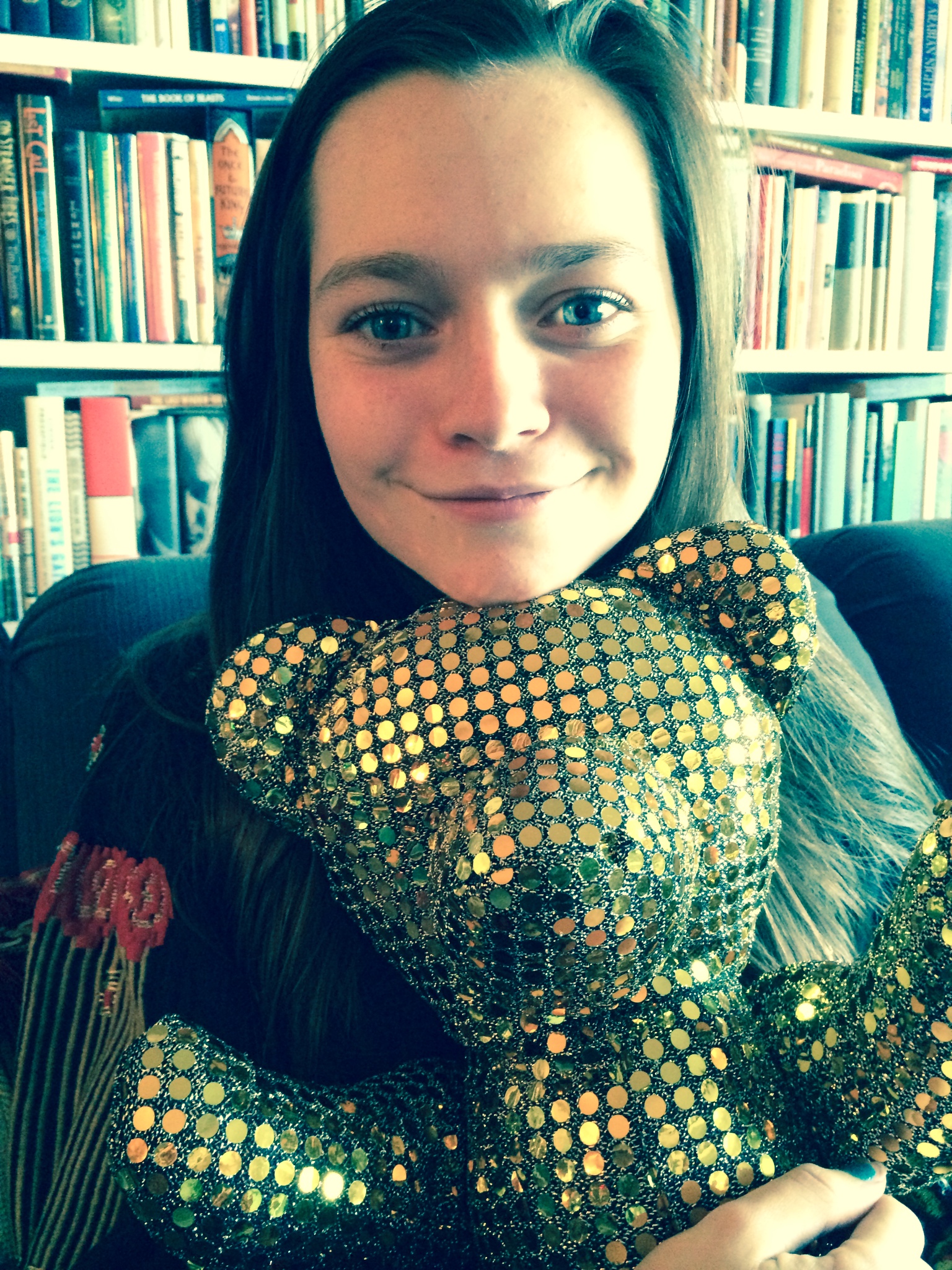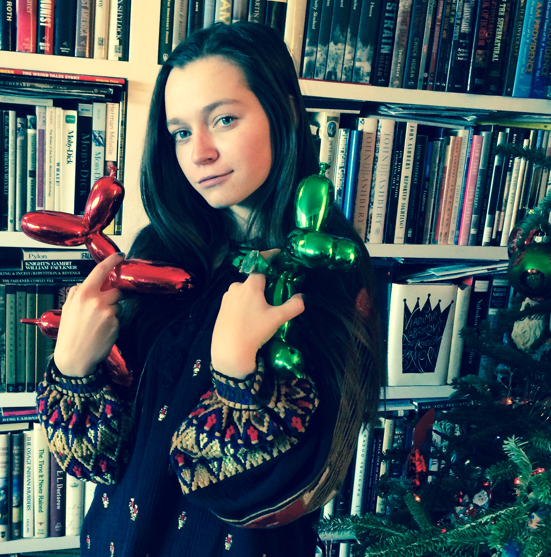 My Look: Topshop golden lion loafers, HUE tights, locket, Posh Earrings, Free People dress by Mes Demoiselles, Freddy Dico sequined bear, and Jeff Koons balloon puppy sculptures in Christmas colors