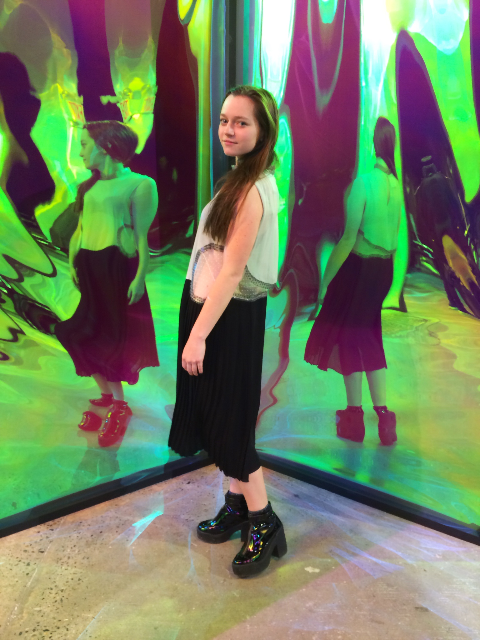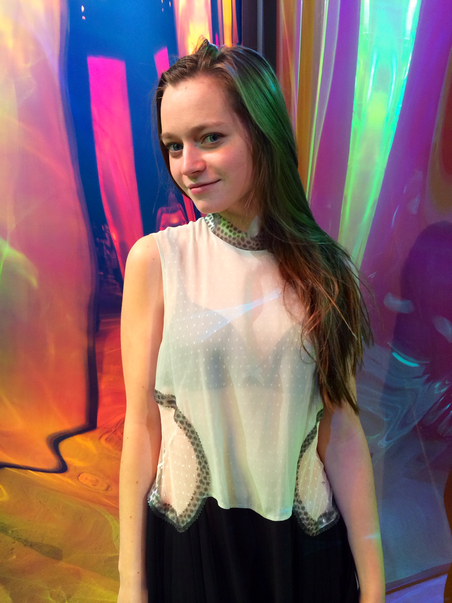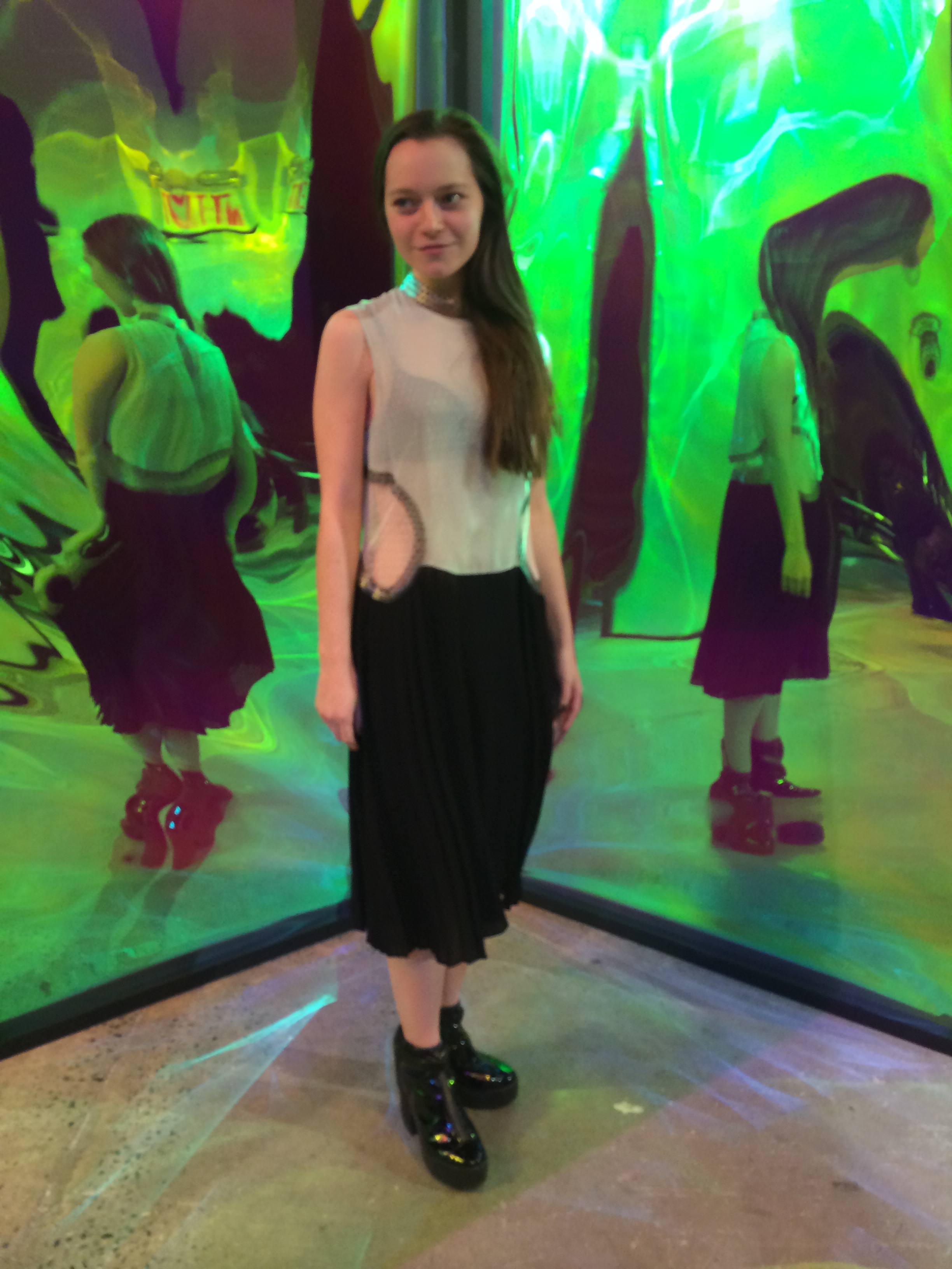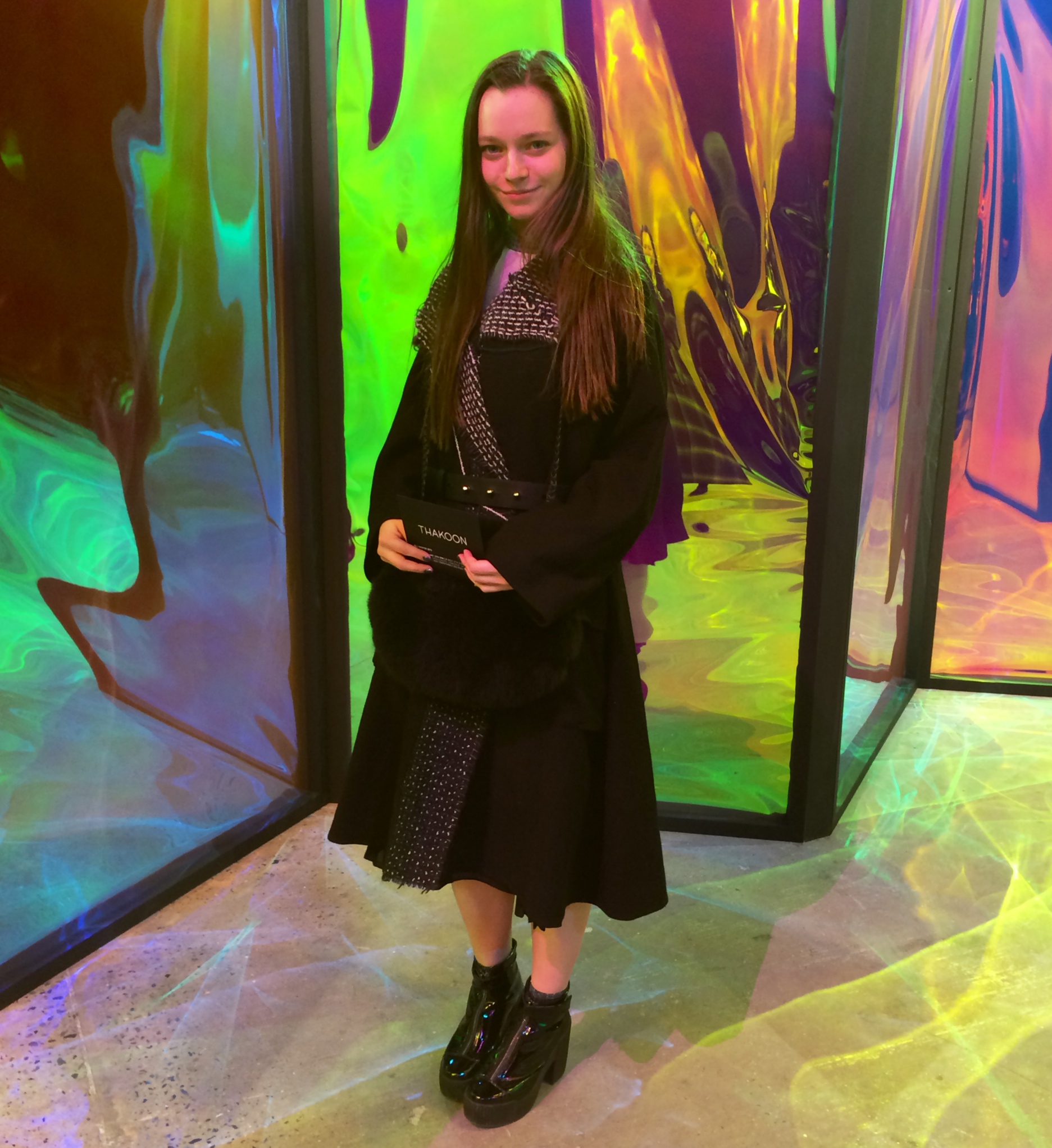 Getting ready for the show was great fun, finding a coat to withstand New York’s cold along with a striking dress and boots to stick out from the crowd. My look, I think, made a statement. The midriff trim is made of lenticular dot material that gives a dizzying but transfixing seam to the dress. The bodice, entirely see-through, is also embroidered in dots in both creamy white and pale mint in contrast with the skirt: pleated on the side but the front, refined and simple, knee-length and elegant. Exposing myself on the top showed off the craftsmanship of the dress, my silhouette drew attention to the detail work of the material and the cut outs. I can’t wait to share with you the next couple of shows: this week is going to be great!