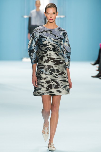 Her outfit was a short dress, blue and grey, painted with a water marble effect, the same design that was printed onto my invitation. Every collection has a couple of unifying aspects; something to draw the entire collection together. For Carolina Herrera’s show, the water inspiration infused every look. Each model’s hair was combed into a tight, slick pony tail, tied with wide silver. The lips were all a shade of dark, bold red with a hint of pink, a contrast to the first couple of pieces that she sent down the runway.