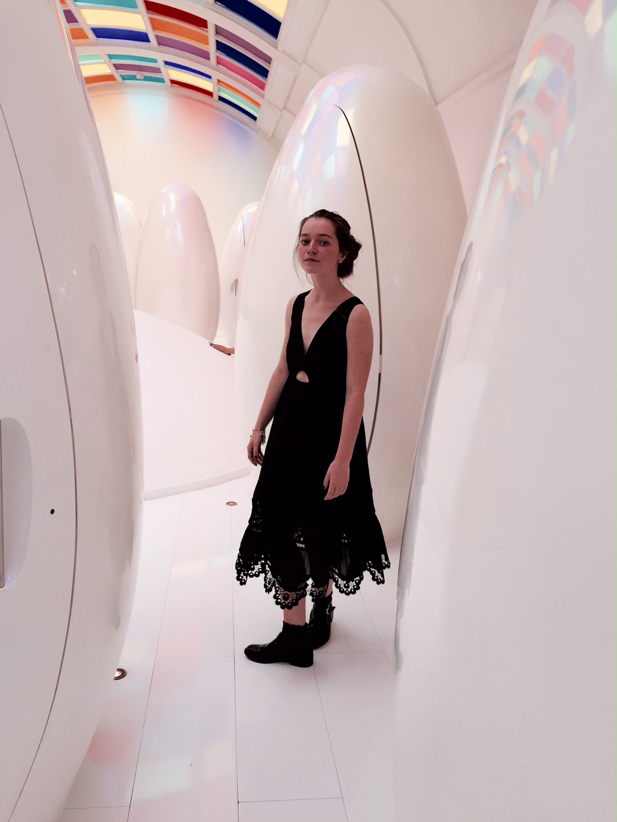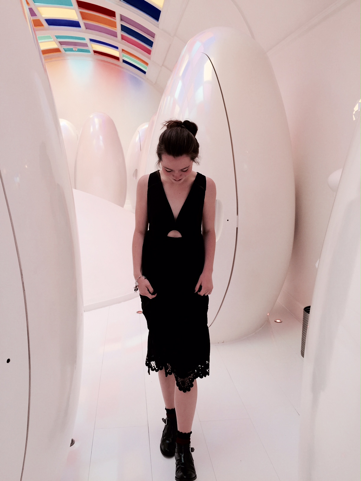 This post was shot in the bathroom of a restaurant. The restaurant is Sketch by world-renowned chef Pierre Gagnaire. Now this is a special bathroom in the heart of London. It is a huge room filled with eggs, each egg a bathroom-stall in which is streamed the sound of croaking frogs. The ceiling is tiled in iridescent lighting and the floor is lit pink to give these pictures the exquisite look of the perfect women’s bathroom.