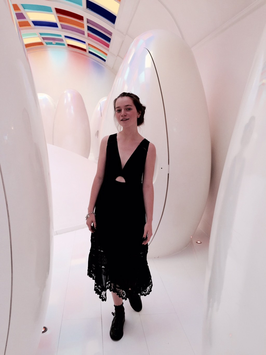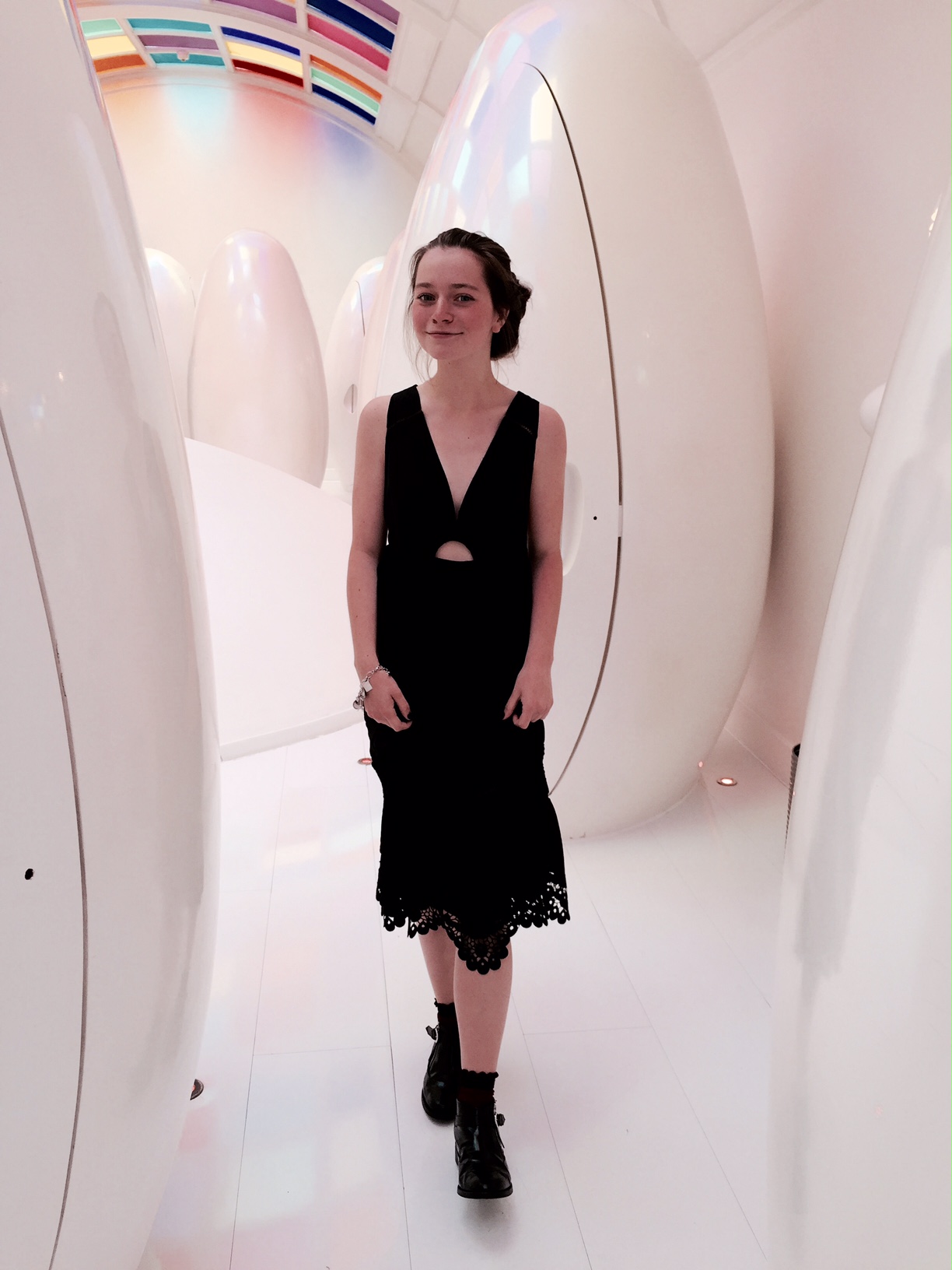 Having been to Sketch before, I knew I wanted to wear an outfit that was not only artistically sophisticated and fitting for high tea but also inventive and fun to pull from the same mindset of the makers of such an incredible restaurant. My dress is by Thakoon, a designer whose new collection I saw at New York Fashion Week. The way Thakoon looks and constructs clothes is beautiful in every respect. He plays with draping, cuts, and sizing to readjust your eye to the wearer’s figure and thus create a sense of intrigue. I tend to play with cuts in this way. For instance, I love a dress with a plunging neck line because it draws your eye into my bone structure and conveys a certain level of confidence, and in doing so forces you to sit with good posture so as not to be overexposed, and therefore appropriately well mannered for high tea. I got this dress two sizes too big to achieve a look that played with the expected structure of a garment and in doing so reveal a different look to my figure. What do you think?