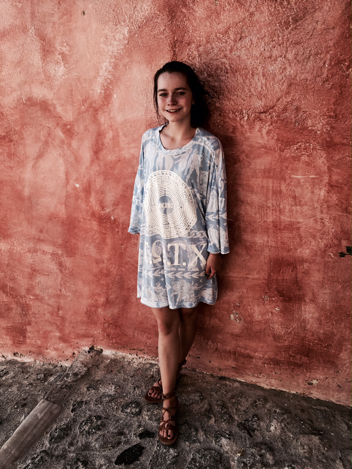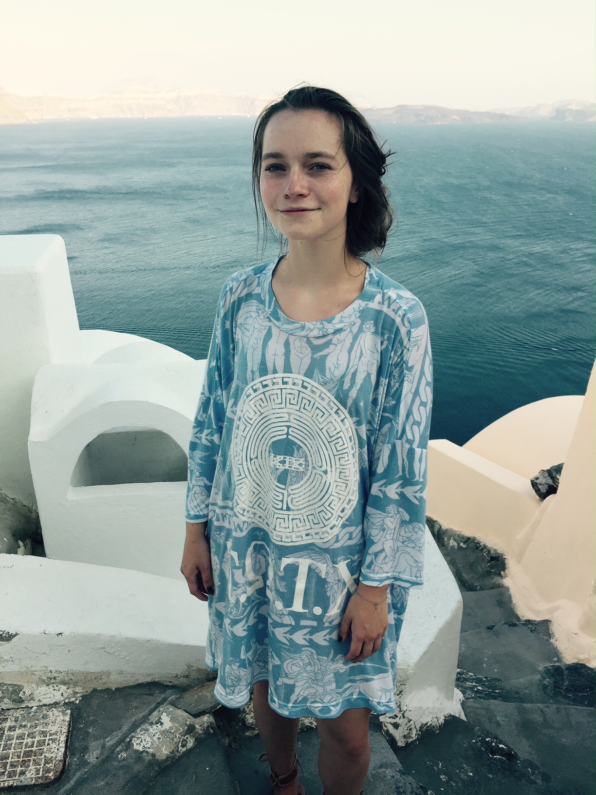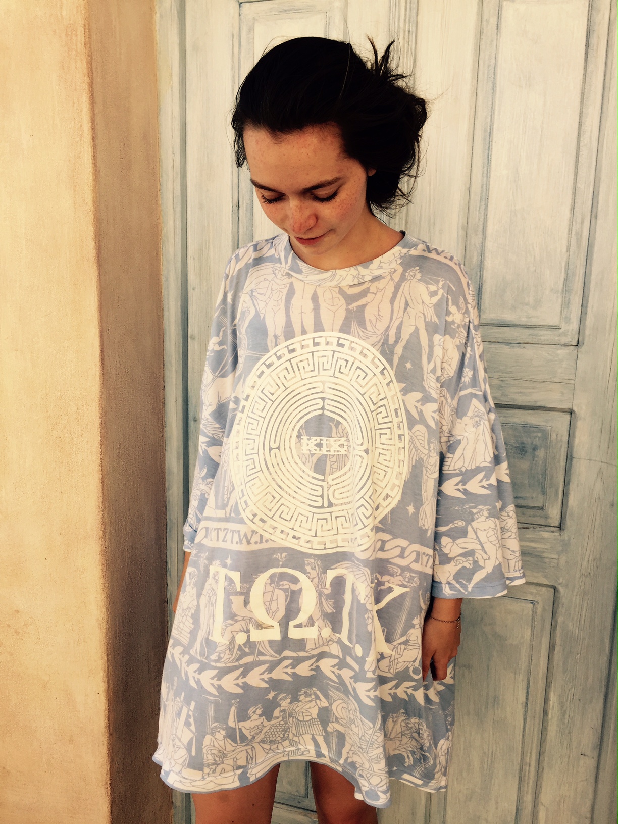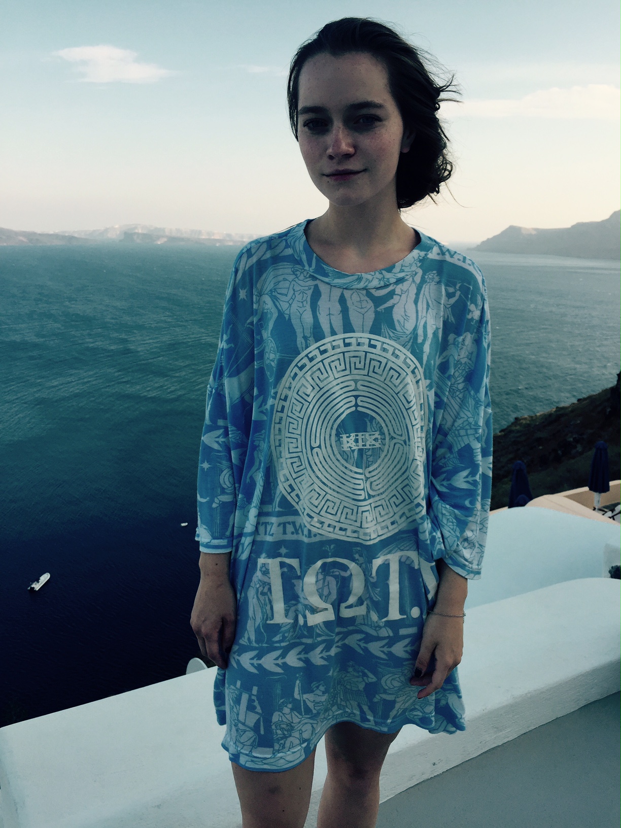 In the next couple of photos from my time in Santorini, I am wearing a KTZ t-shirt. I am wearing it as a dress. Having seen KTZ’s runway show in New York, I knew the designer’s love of history and how he makes history present in all of his work. This shirt embodies a graphic depiction of a very old design. This shirt is sporty and soft, relaxed and iconically Greek. I love that this shirt, although decidedly modern in fit and aesthetic, almost rapper-like in taste, feels and breaths like it would have in ancient times. The design depicts great war heroes and deities. It has the designs that would have been found on Ancient Greek pottery to tell my story as the wearer. It is colored in blue and white to play off of the typically Greek white architectural design and the eye-catching blue of the Mediterranean. The sandals paired with this dress are ones I picked up in Athens. They are handmade to my foot in one of the most traditional Greek sandal shops there are. I love that both of these pieces, although one so new and one so old, seem to complement each other against the backdrop of such an unbelievable place.