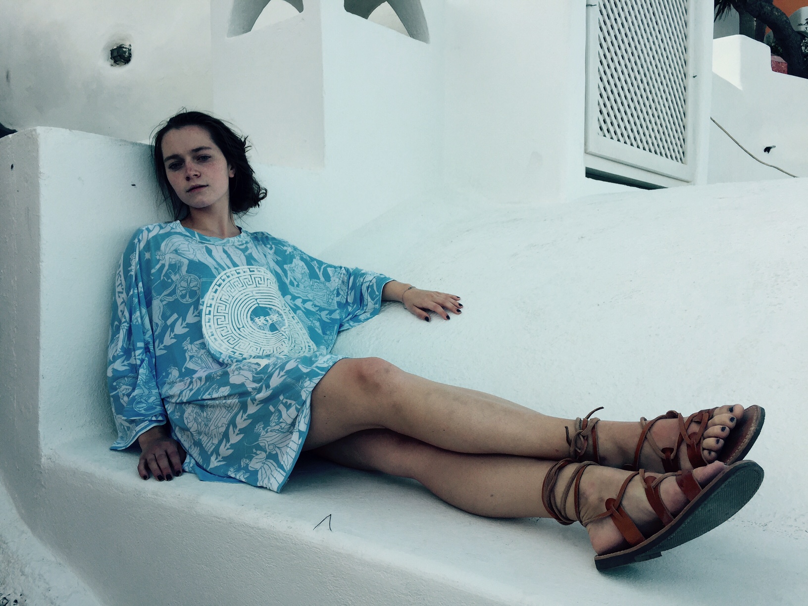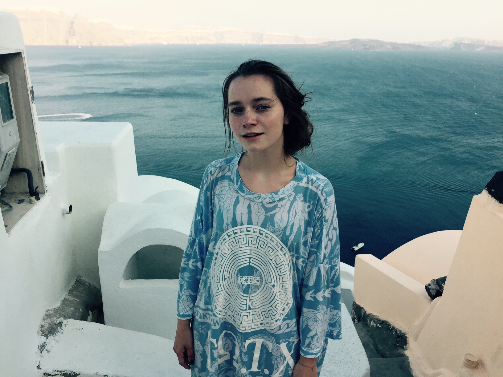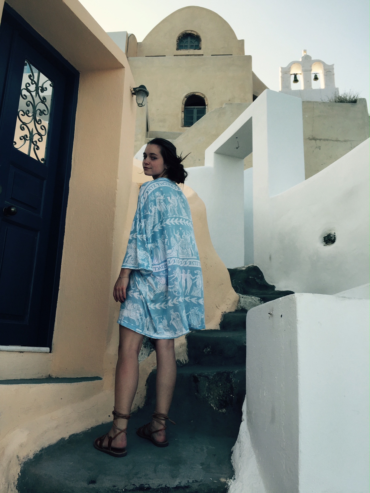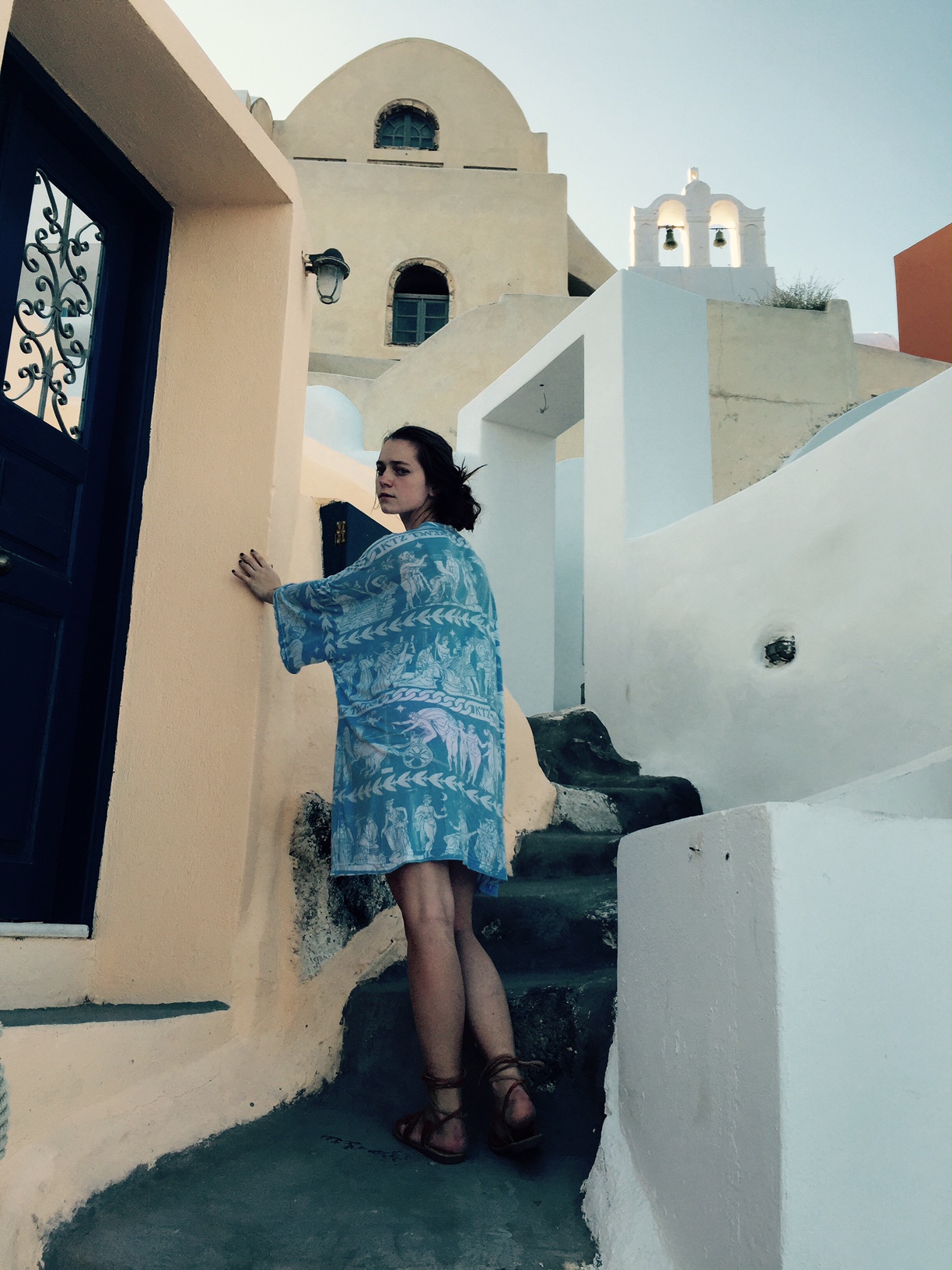 In the next couple of photos from my time in Santorini, I am wearing a KTZ t-shirt. I am wearing it as a dress. Having seen KTZ’s runway show in New York, I knew the designer’s love of history and how he makes history present in all of his work. This shirt embodies a graphic depiction of a very old design. This shirt is sporty and soft, relaxed and iconically Greek. I love that this shirt, although decidedly modern in fit and aesthetic, almost rapper-like in taste, feels and breaths like it would have in ancient times. The design depicts great war heroes and deities. It has the designs that would have been found on Ancient Greek pottery to tell my story as the wearer. It is colored in blue and white to play off of the typically Greek white architectural design and the eye-catching blue of the Mediterranean. The sandals paired with this dress are ones I picked up in Athens. They are handmade to my foot in one of the most traditional Greek sandal shops there are. I love that both of these pieces, although one so new and one so old, seem to complement each other against the backdrop of such an unbelievable place.