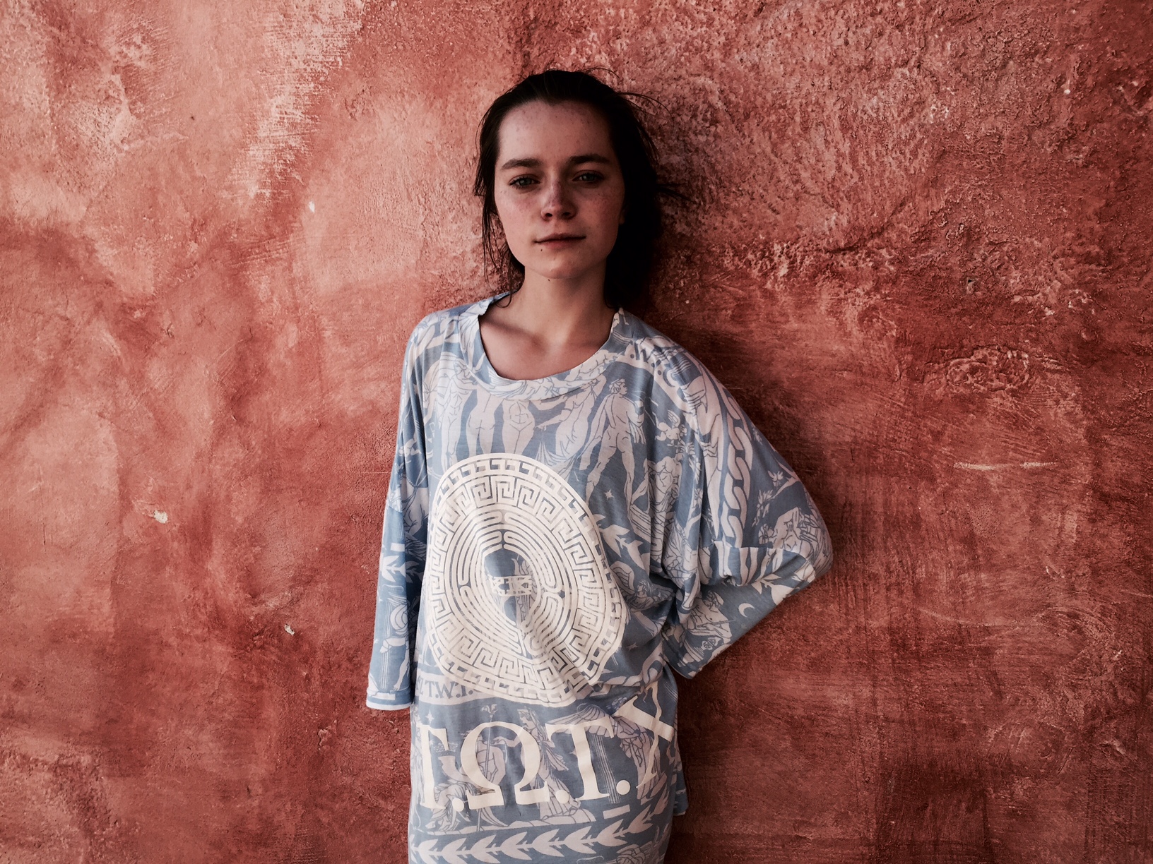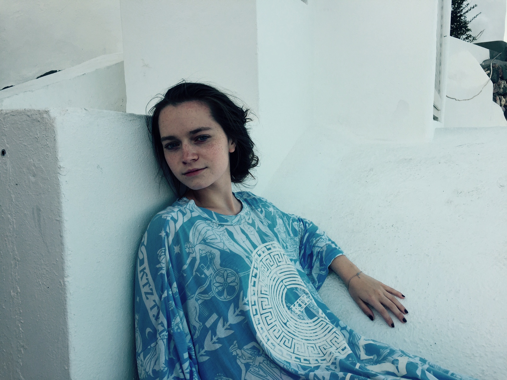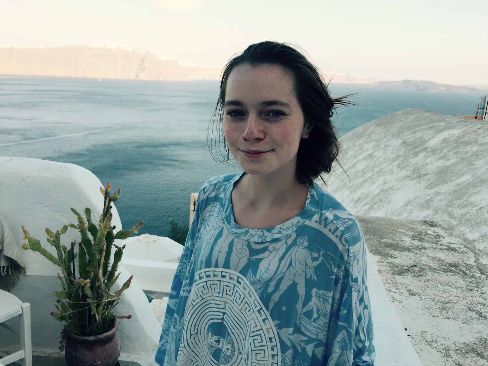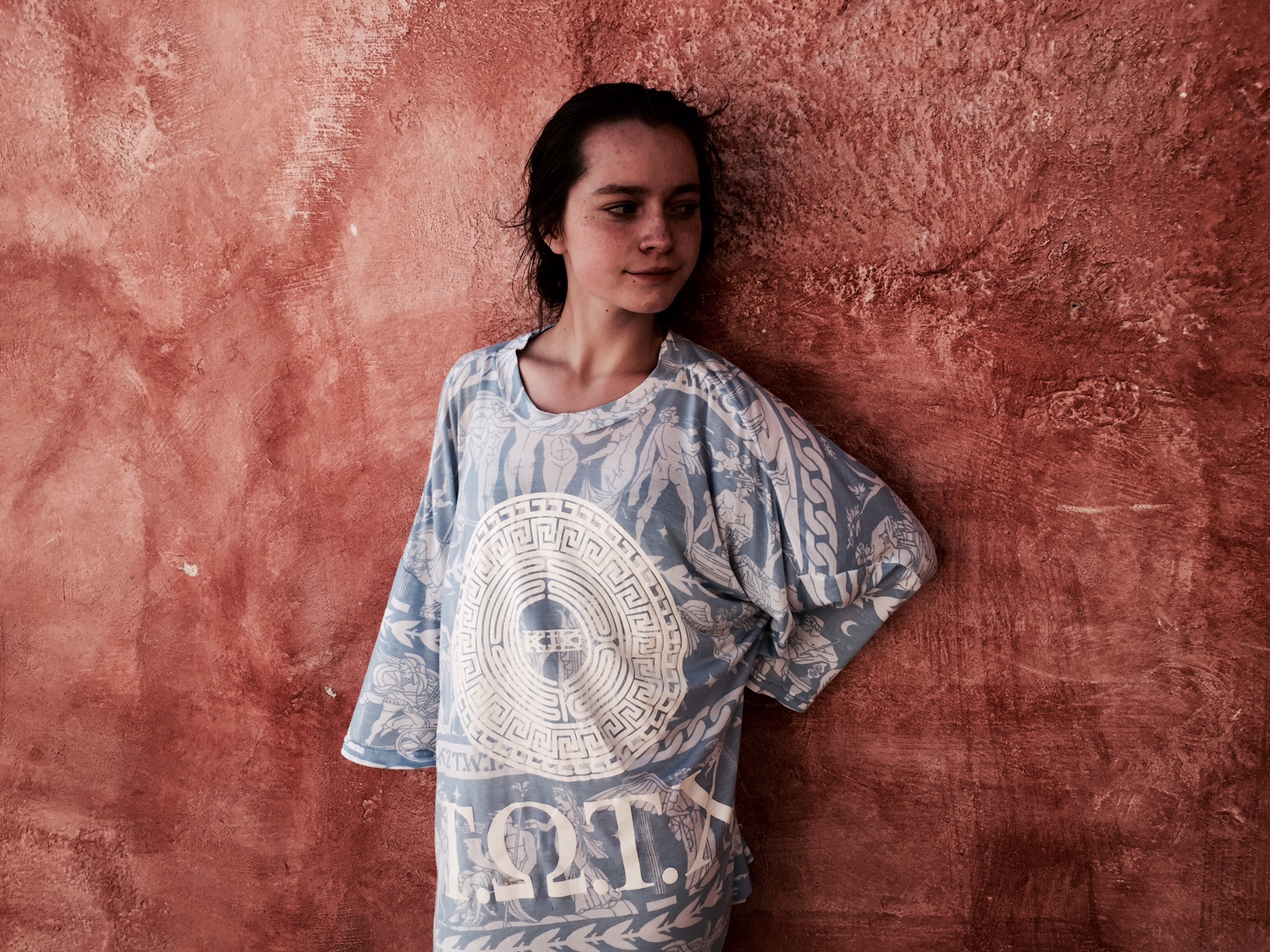 In the next couple of photos from my time in Santorini, I am wearing a KTZ t-shirt. I am wearing it as a dress. Having seen KTZ’s runway show in New York, I knew the designer’s love of history and how he makes history present in all of his work. This shirt embodies a graphic depiction of a very old design. This shirt is sporty and soft, relaxed and iconically Greek. I love that this shirt, although decidedly modern in fit and aesthetic, almost rapper-like in taste, feels and breaths like it would have in ancient times. The design depicts great war heroes and deities. It has the designs that would have been found on Ancient Greek pottery to tell my story as the wearer. It is colored in blue and white to play off of the typically Greek white architectural design and the eye-catching blue of the Mediterranean. The sandals paired with this dress are ones I picked up in Athens. They are handmade to my foot in one of the most traditional Greek sandal shops there are. I love that both of these pieces, although one so new and one so old, seem to complement each other against the backdrop of such an unbelievable place.