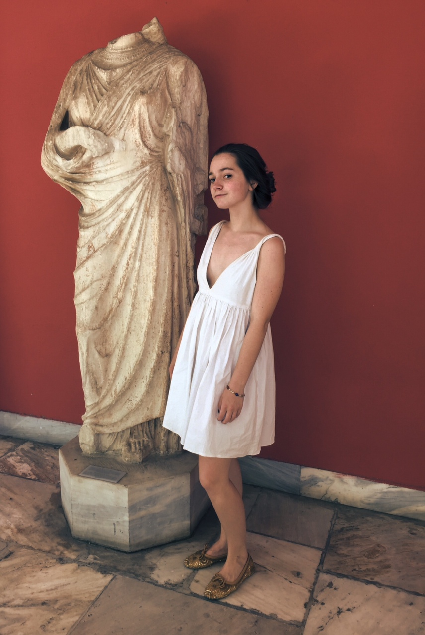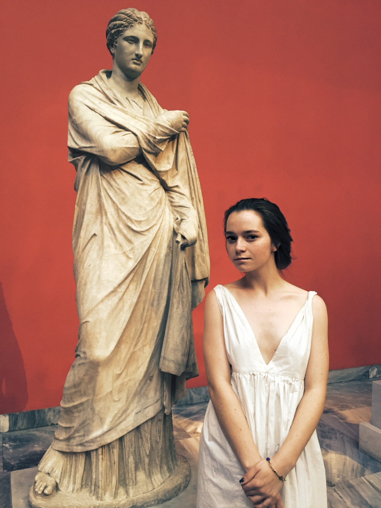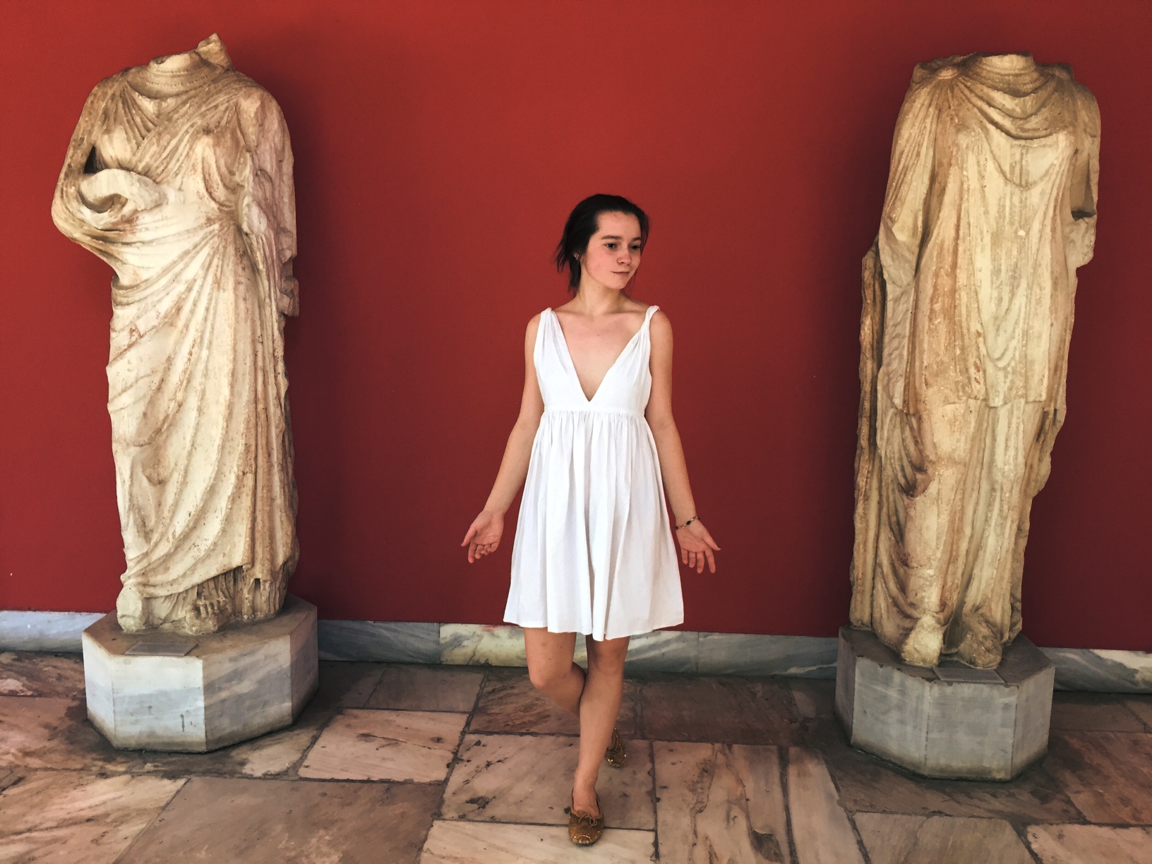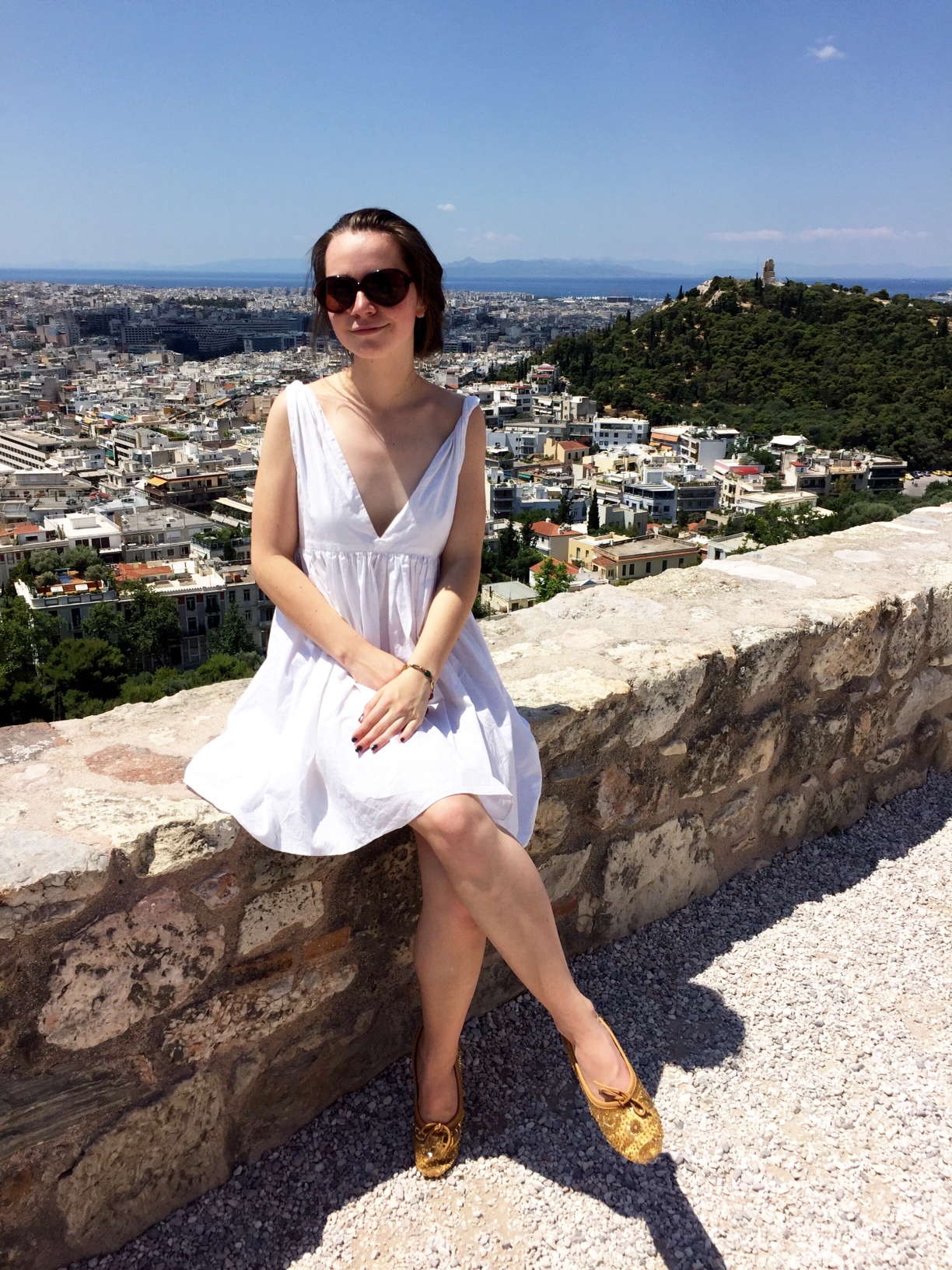 The silhouette of a particular outfit can also change the way you wear it. Certain ensembles require you to stand with a certain poise, others with a shorter walk, and some to step with confidence for full effect. The dress I am wearing in the next couple of photos is classic. It is a simple dress. It is one of my favorites. It is so simple yet people say, “wow, what a dress.” I doubt it was designed the way I wear it. It is in a much larger size, hence its plunging neckline deeper than normal, and its baby-doll style is magnified when looked at from the side. I love its silhouette. When wearing this dress I feel as if I am a character. This dress, with its almost mushroom-like bottom, makes me feel like I am in Tim Burton’s Alice in Wonderland, and so I walk with a certain lightness that makes me lean forward slightly. I love it. I absolutely love it. And there is no place better than to wear it then Athens, Greece: a place where the people portrayed in art were done in profile.