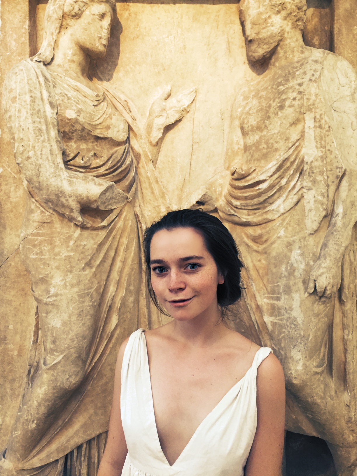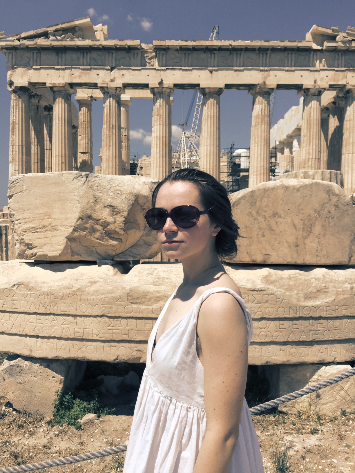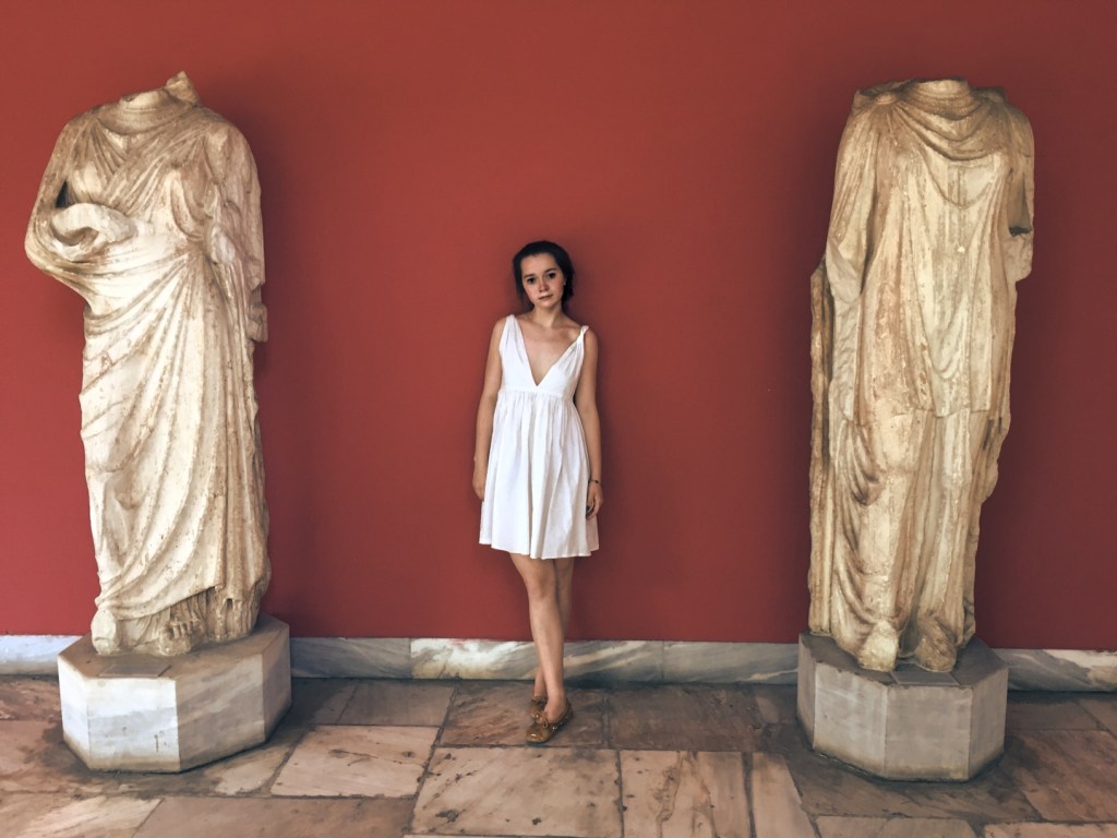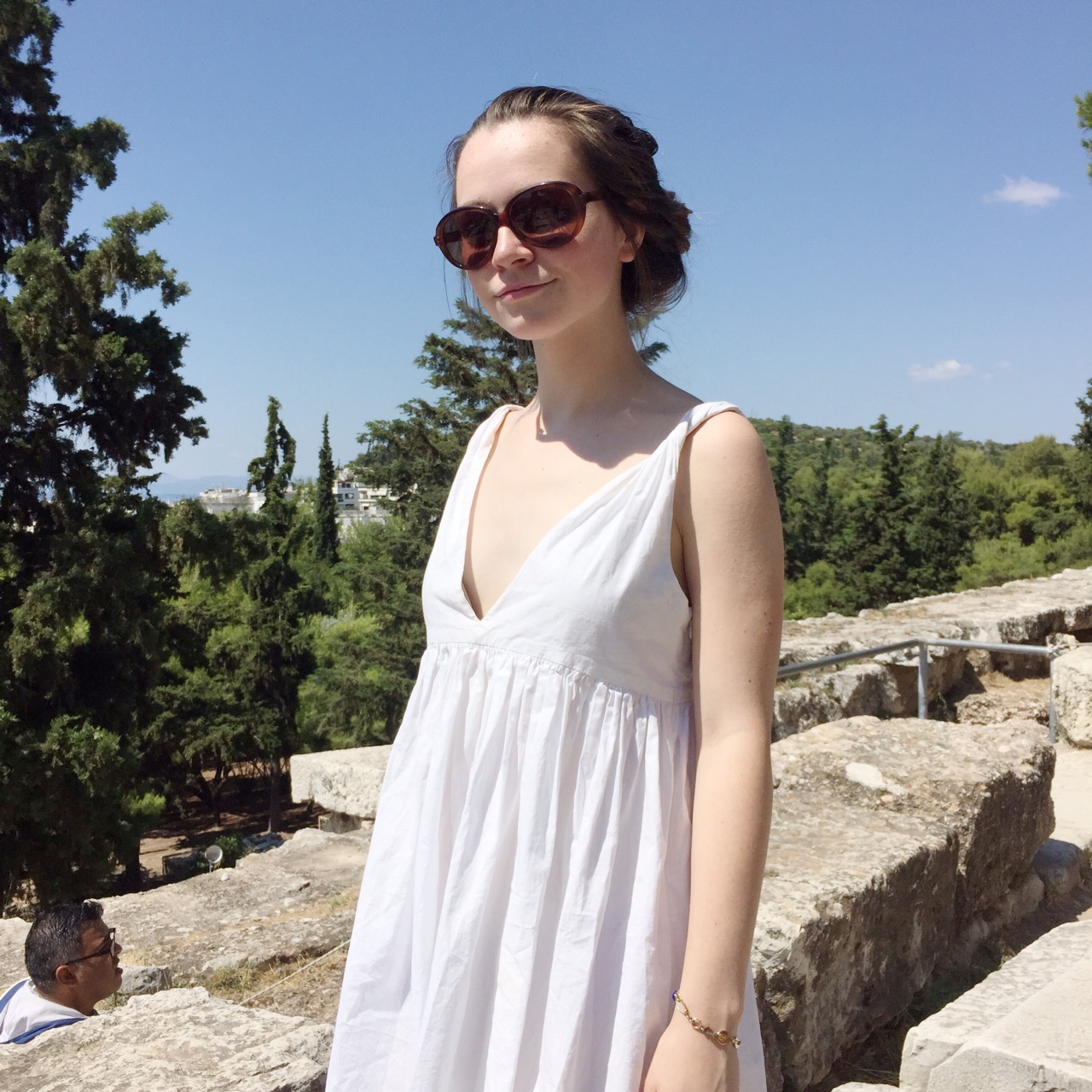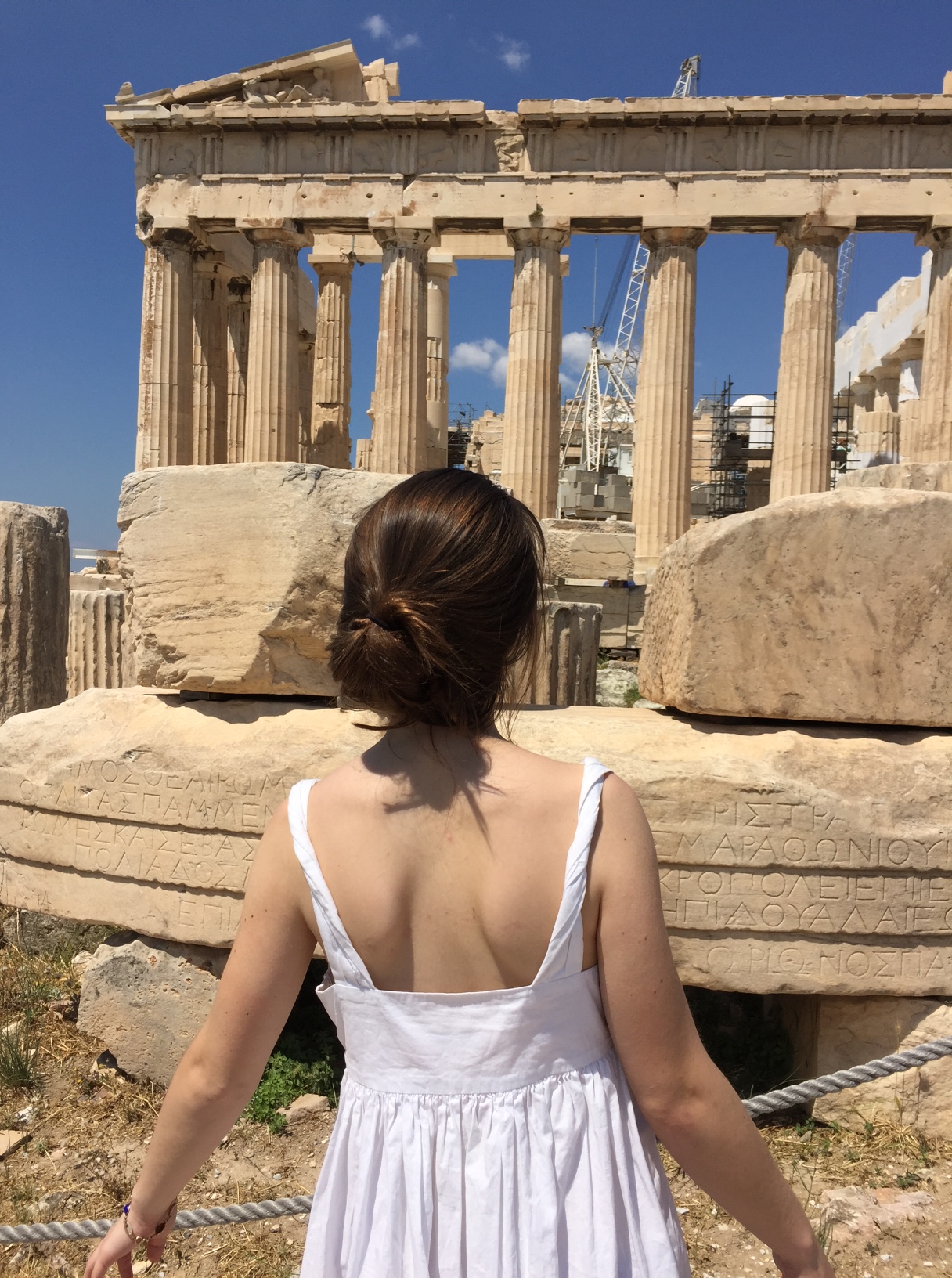 The silhouette of a particular outfit can also change the way you wear it. Certain ensembles require you to stand with a certain poise, others with a shorter walk, and some to step with confidence for full effect. The dress I am wearing in the next couple of photos is classic. It is a simple dress. It is one of my favorites. It is so simple yet people say, “wow, what a dress.” I doubt it was designed the way I wear it. It is in a much larger size, hence its plunging neckline deeper than normal, and its baby-doll style is magnified when looked at from the side. I love its silhouette. When wearing this dress I feel as if I am a character. This dress, with its almost mushroom-like bottom, makes me feel like I am in Tim Burton’s Alice in Wonderland, and so I walk with a certain lightness that makes me lean forward slightly. I love it. I absolutely love it. And there is no place better than to wear it then Athens, Greece: a place where the people portrayed in art were done in profile.
